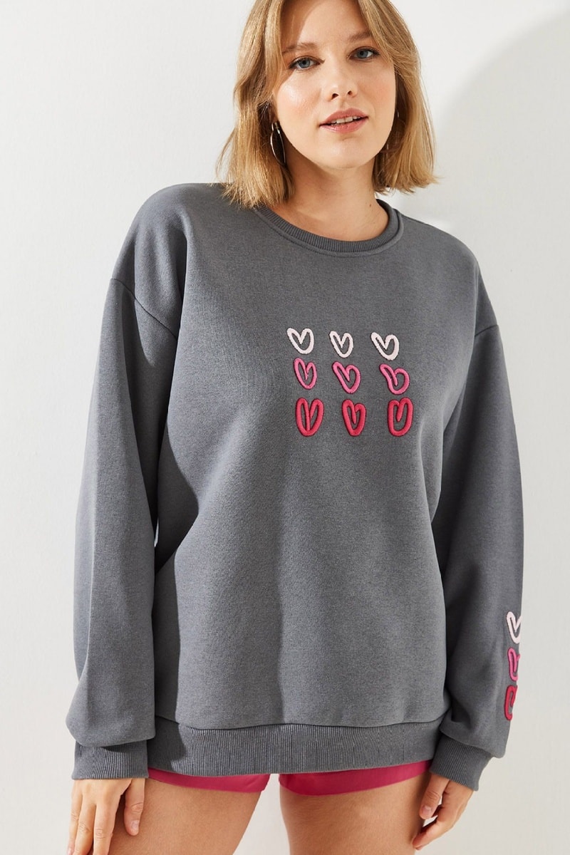 Estampado de corações bordado à frente e na manga esquerda.