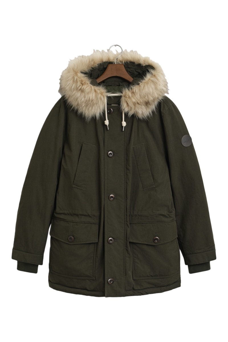 Parca regular com capuz com pelo sintético e atilhos de ajuste.
