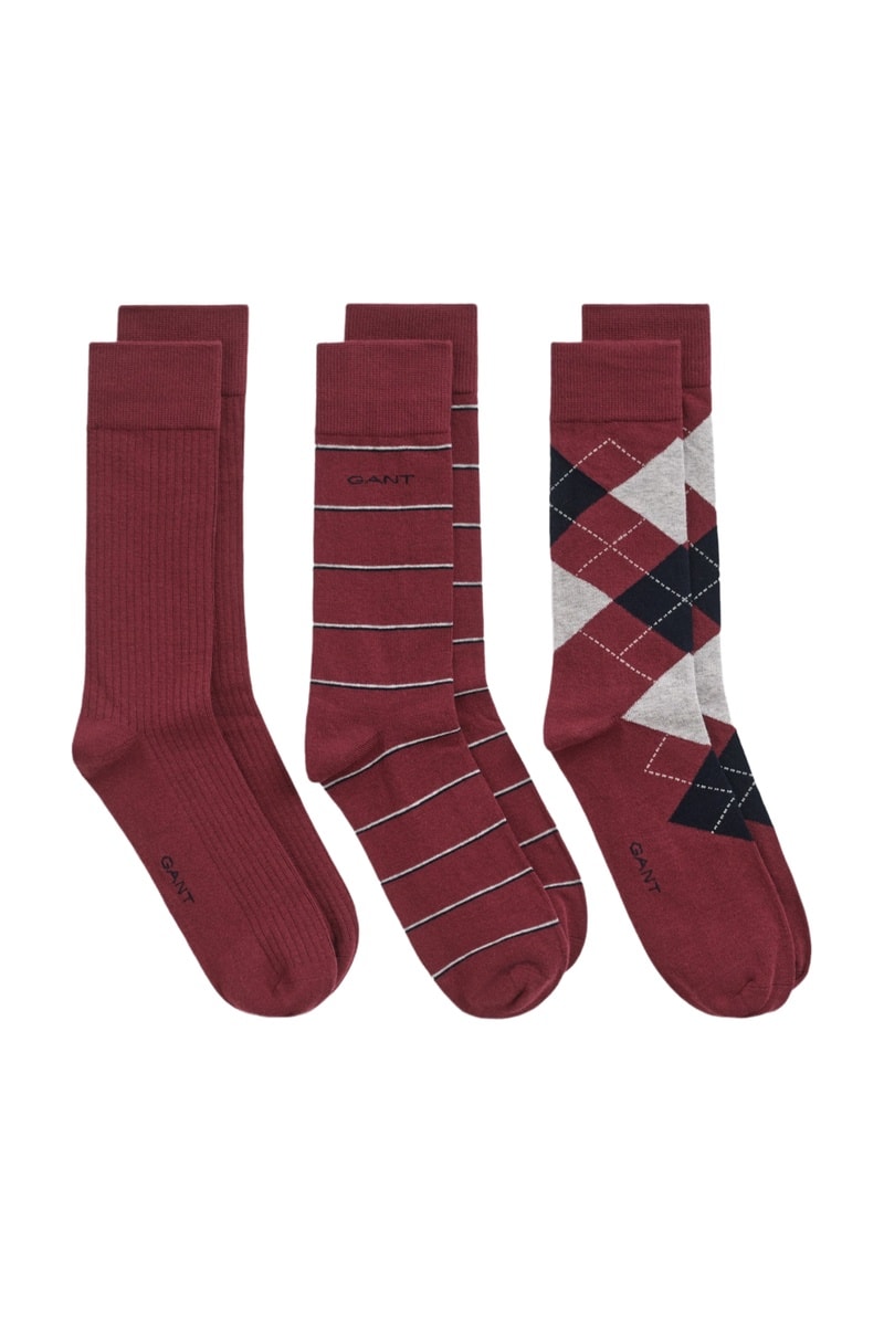 3 pares de meias 1 dos quais com estampado às riscas e 1 com estampado geométrico.