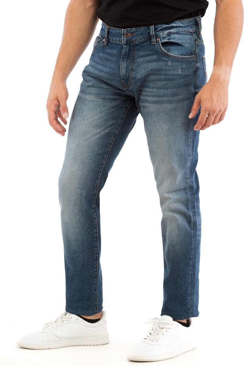 Calças de ganga corte cenoura.