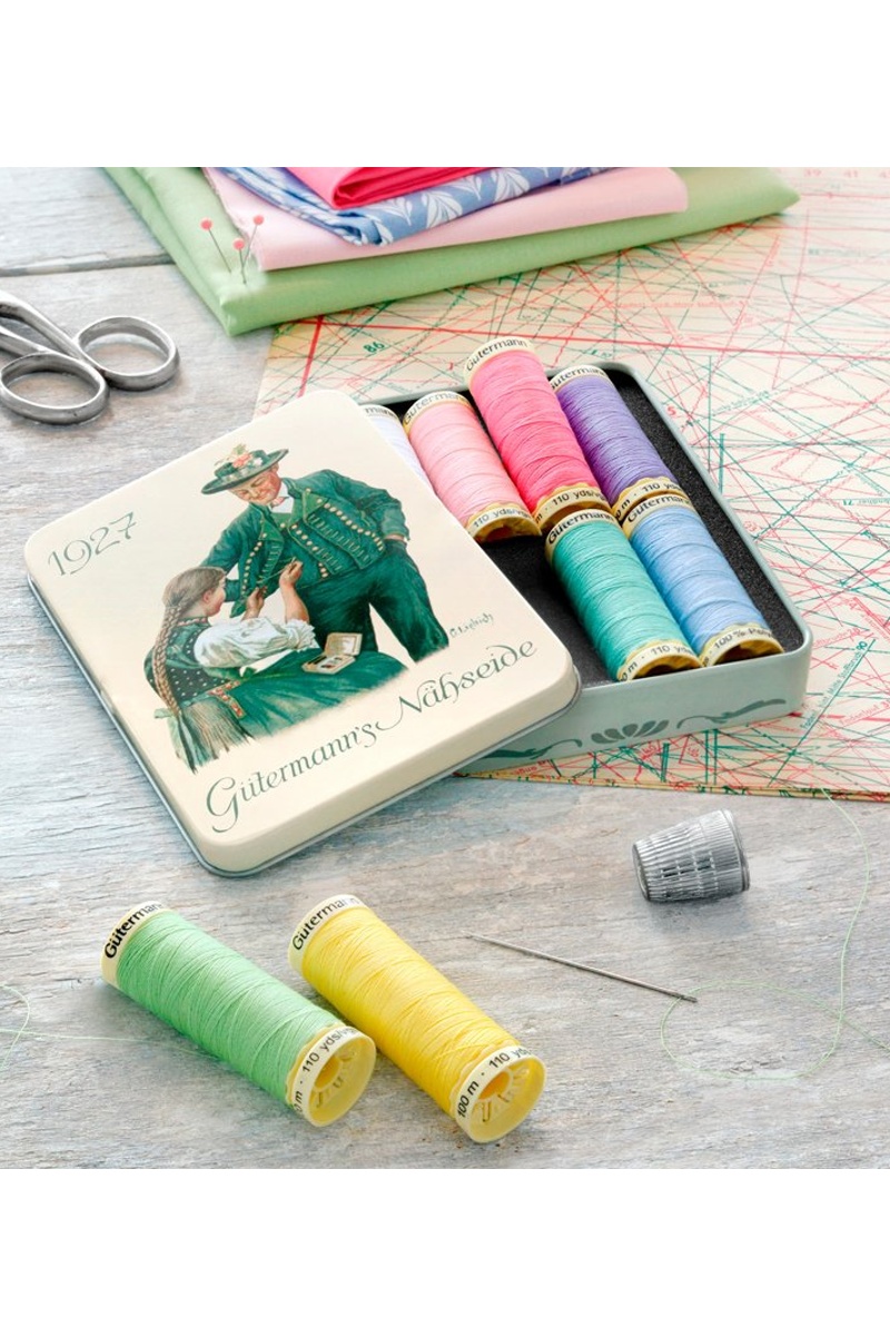 Caixa de arrumação com desenho nostálgico, cheia com 8 bobinas.