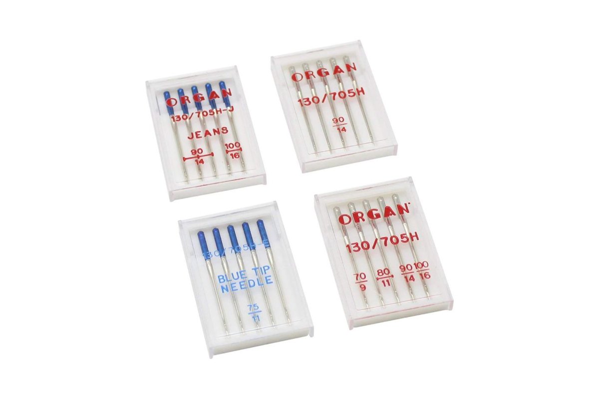 O conjunto contém: 1 conjunto de agulhas diferentes, 1 estojo de agulhas para gangas, 1 estojo de agulhas standard nº90 e 1 estojo de agulhas (tecidos médios / finos, bordados, elásticos...).