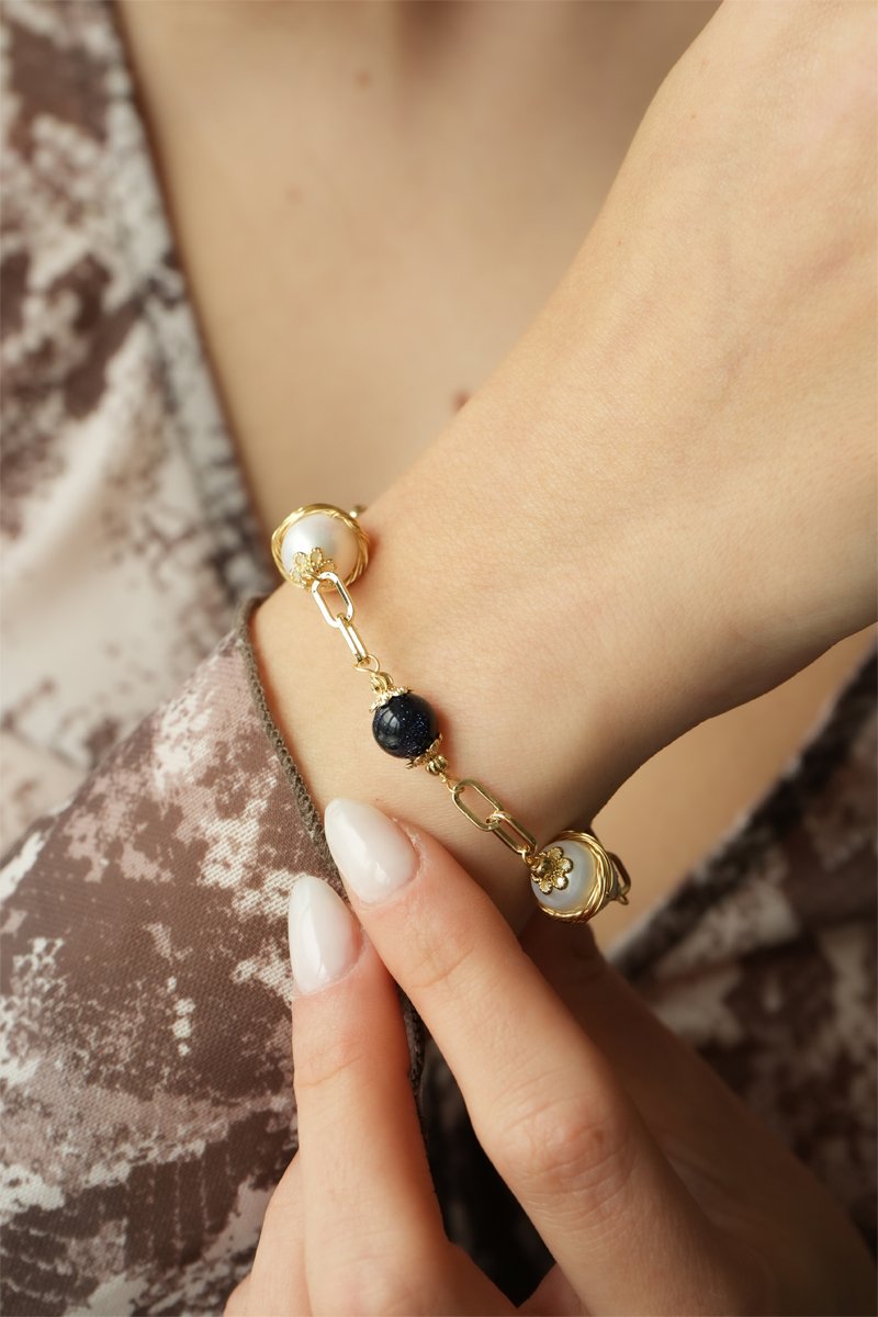 Pulseira banhada a ouro amarelo com 3 ónix e 2 pérolas de cultura.