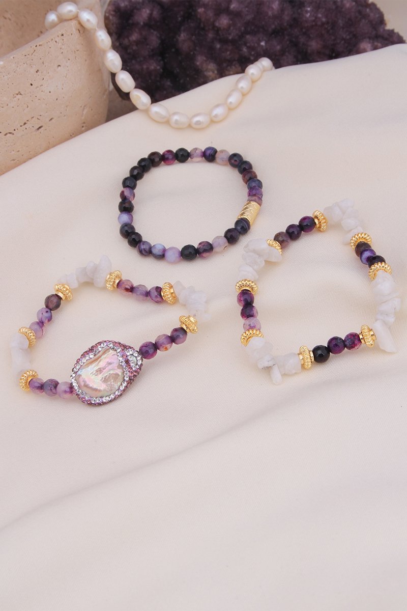 3 pulseiras - Banhado a ouro amarelo, ametistas, pedras da lua e pérola de cultura