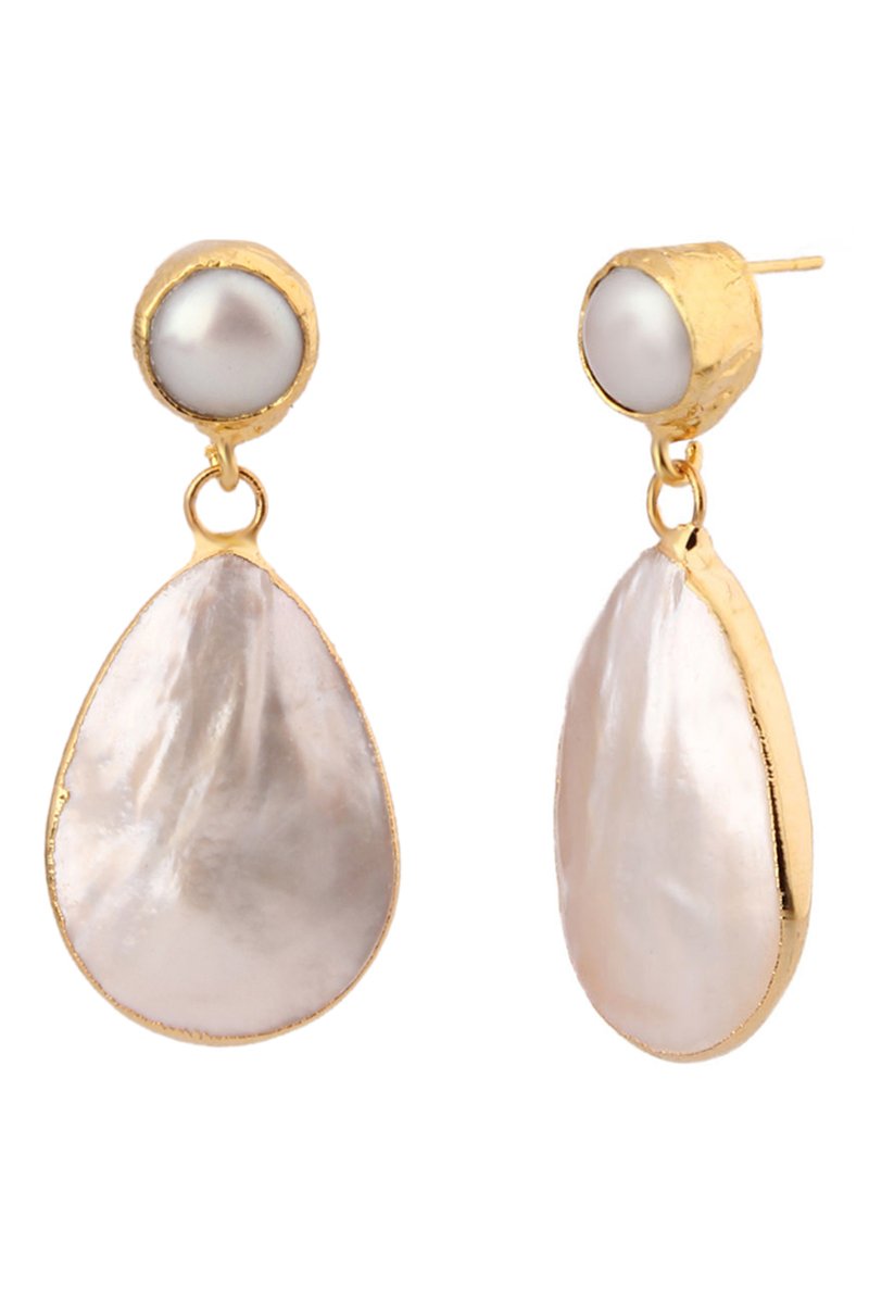 Brincos pendentes em bronze incrustados com nácar e uma pérola de cultura.