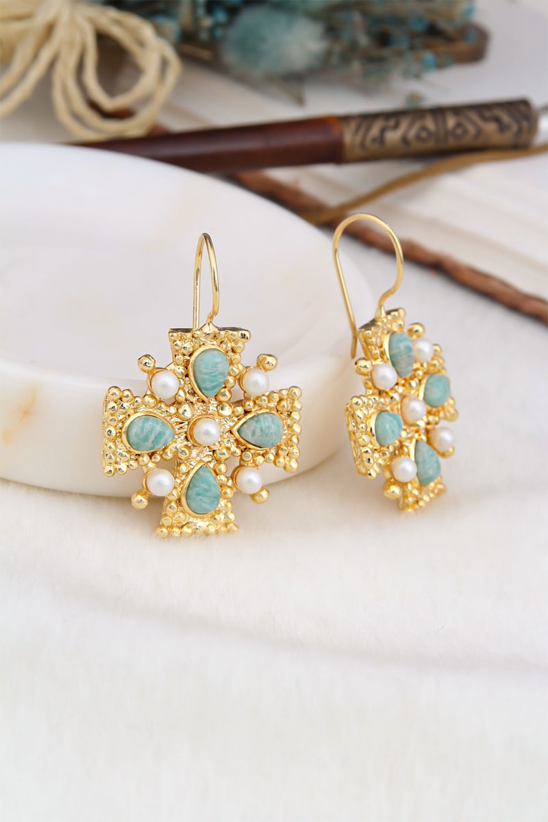 Brincos com 4 amazonites e 5 pérolas de imitação.