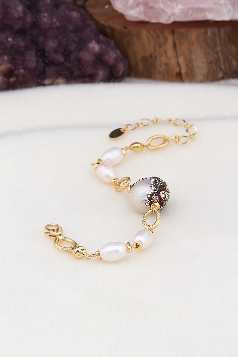Pulseira banhada a ouro amarelo com 5 pérolas de imitação.