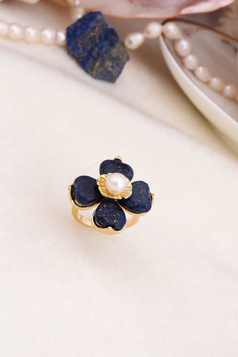 Anel regulável banhado a ouro amarelo com uma pérola de imitação e 4 cristais.