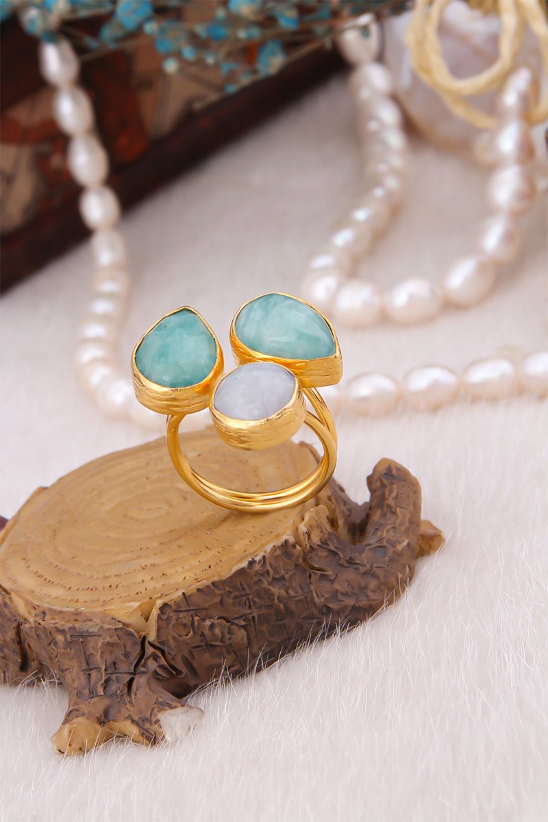 Anel ajustável com 2 amazonitas e uma pedra da lua.