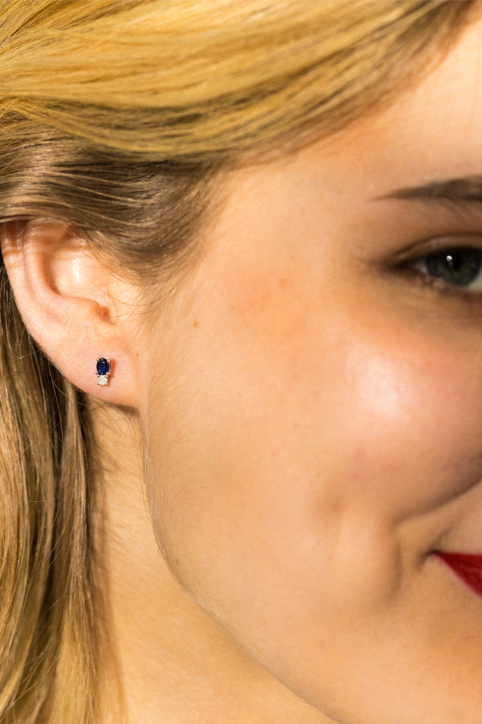 Brincos de ouro branco com um diamante e uma safira.
