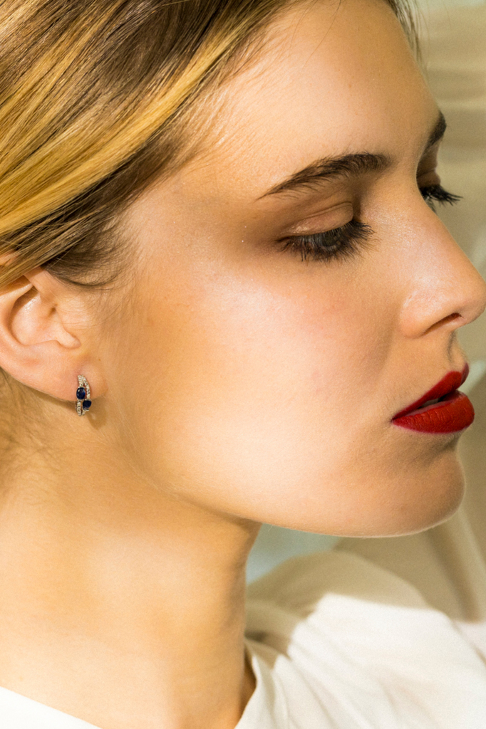 Argolas de ouro branco com 7 diamantes e 2 safiras.