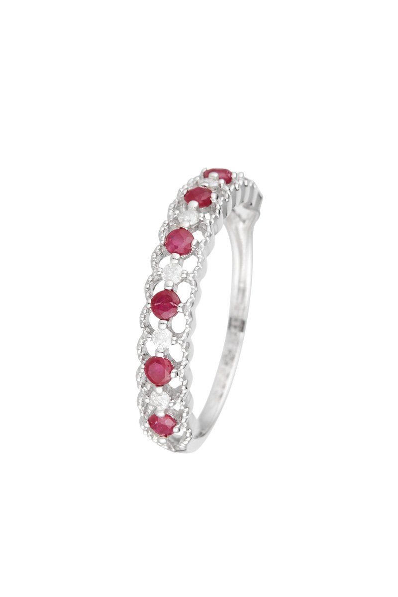 Anel de ouro branco com 6 diamantes e 7 rubis.
