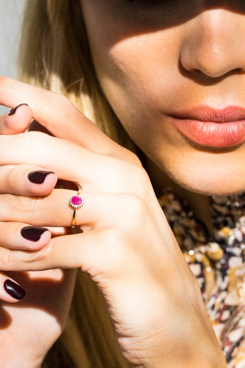 Anel Capiz - Ouro amarelo, diamantes 0,06 quilates/18 e rubis 0,55 quilates/1