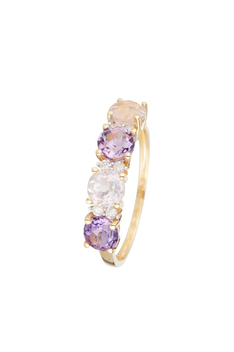 Anel de ouro amarelo com 6 diamantes, 2 quartzos rosas e 2 ametistas.