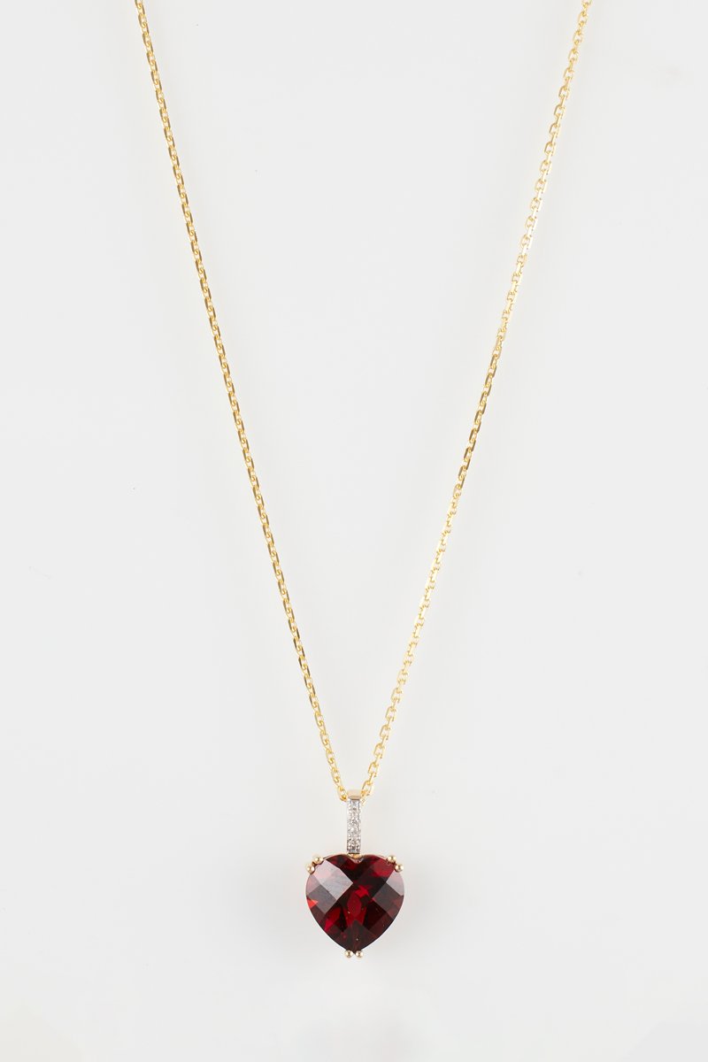 Pendente de ouro amarelo com diamantes e uma granada.
