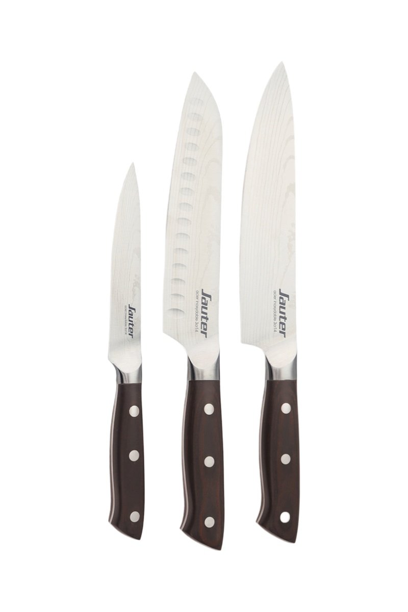 3 facas em aço inoxidável e madeira