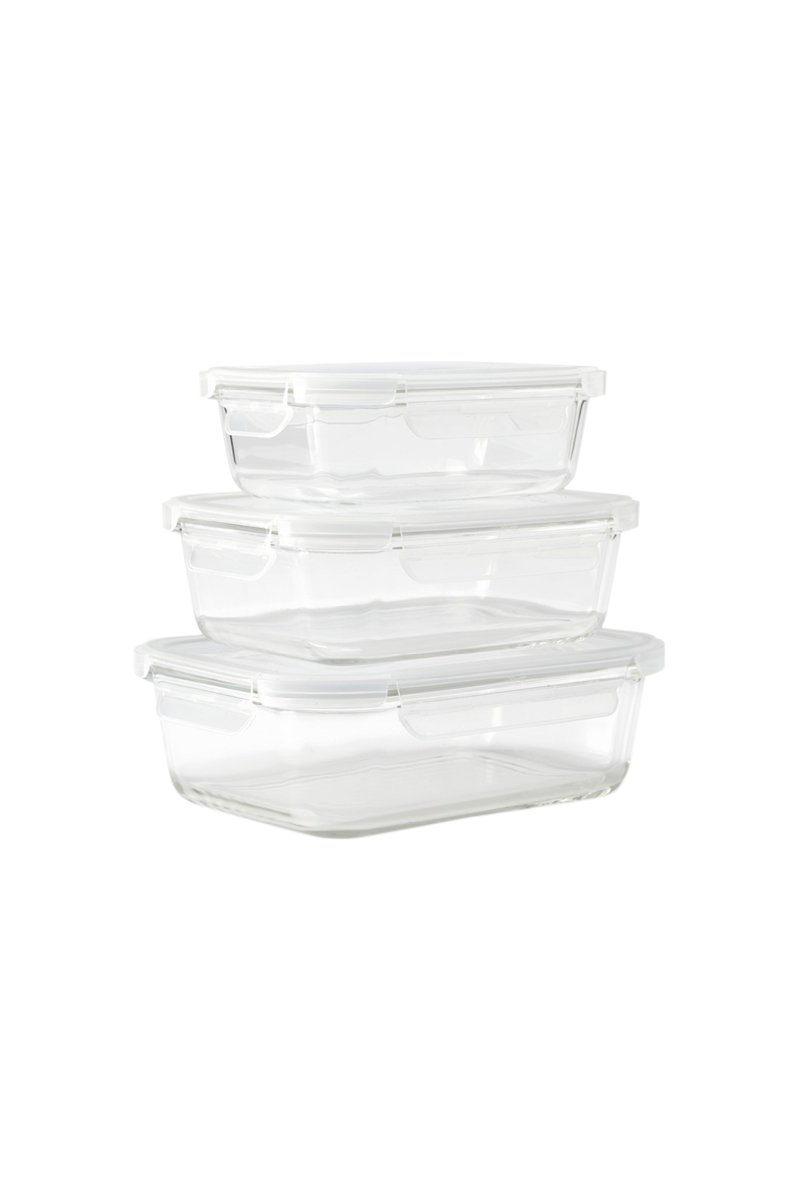 3 caixas de conservação em vidro borossilicato com tampas herméticas.