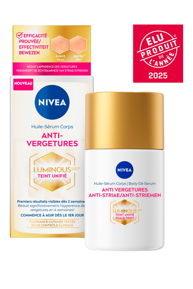 A fórmula única óleo-sérum com a molécula patenteada Luminous 630 equilibra a produção natural de melanina, atenua o contraste entre as estrias e a pele.