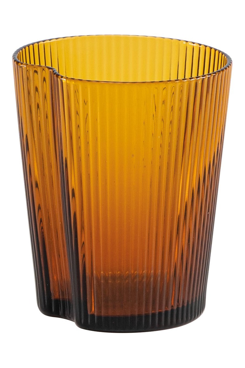 Fabricada em vidro soprado à boca, a coleção assegura uma pega confortável e segura e distingue-se pela sua superfície adornada com finas ranhuras verticais.