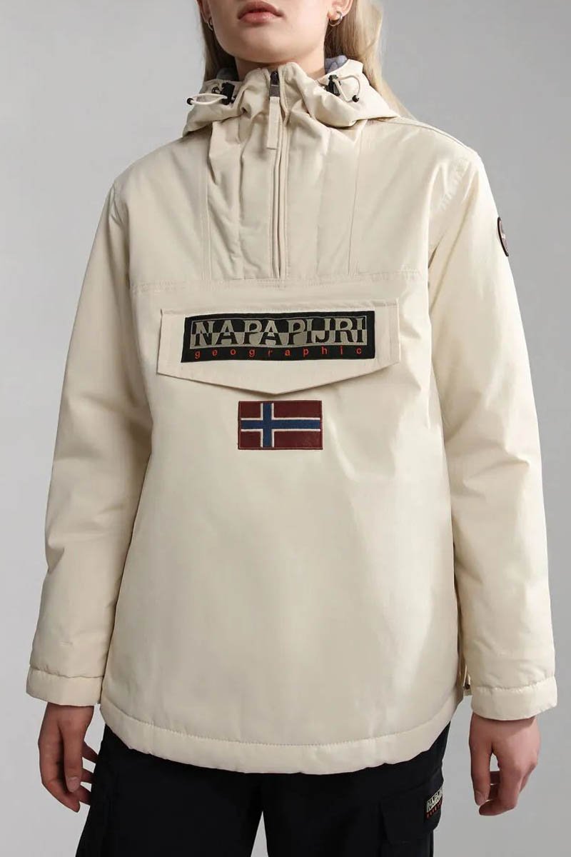 Casaco com capuz com atilhos de atar, travões de cordão e tira ajustável.