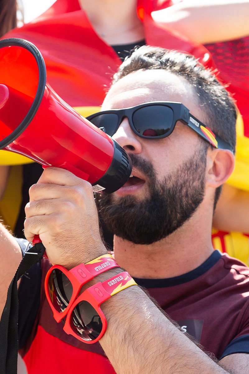 Hastes flexíveis em silicone e aço com padrão fantasia inspirado na bandeira espanhola e inscrição.