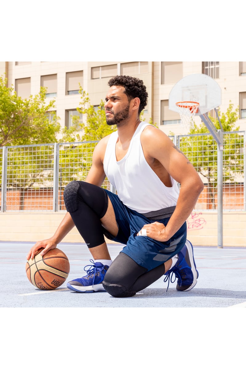 Almofada central em colmeia anti-colisão que envolve o joelho para maior conforto e proteção contra os golpes, os choques e os riscos.