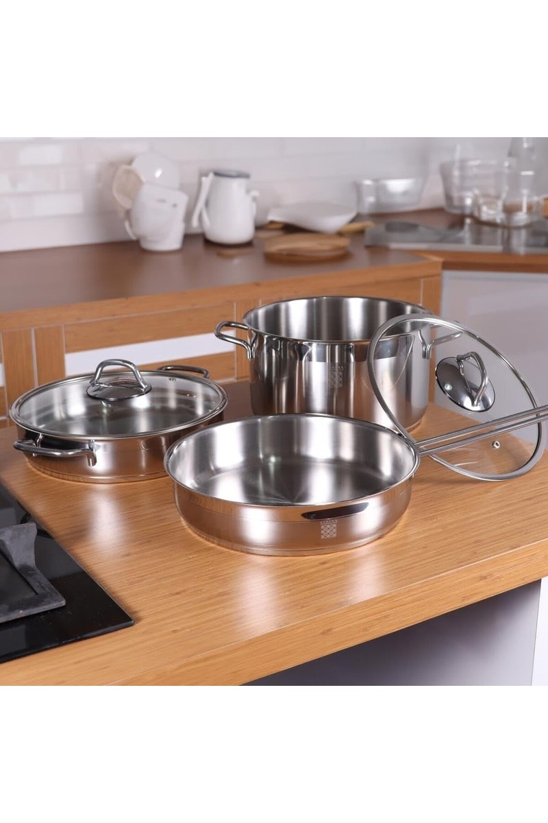 Panelas, fogão e pegas: aço inoxidável.