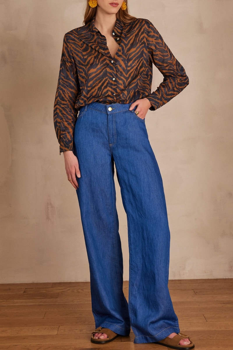 Calças de ganga em linho cintura subida - Índigo