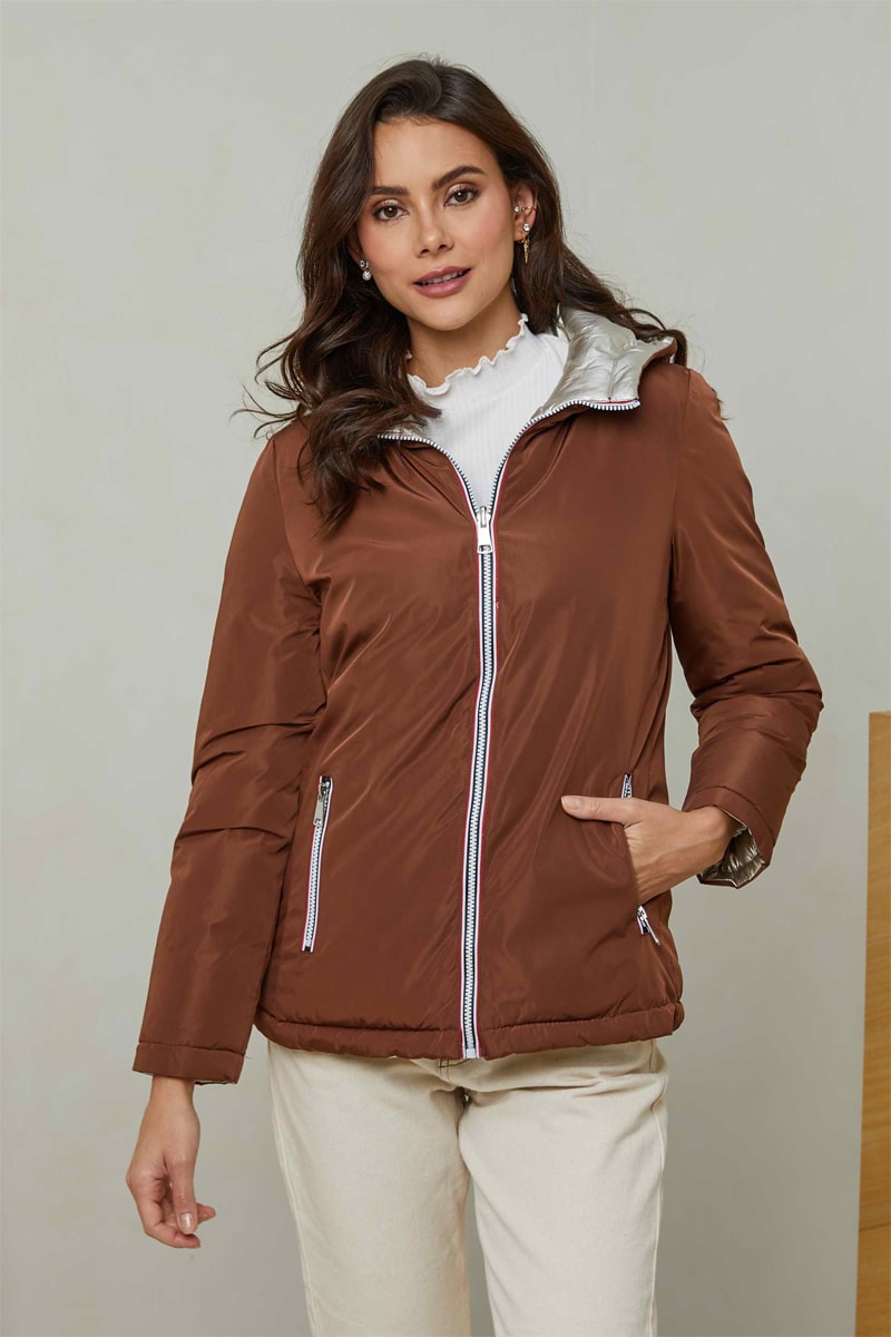 Blusão reversível com capuz e atilhos de ajuste de mangas compridas.