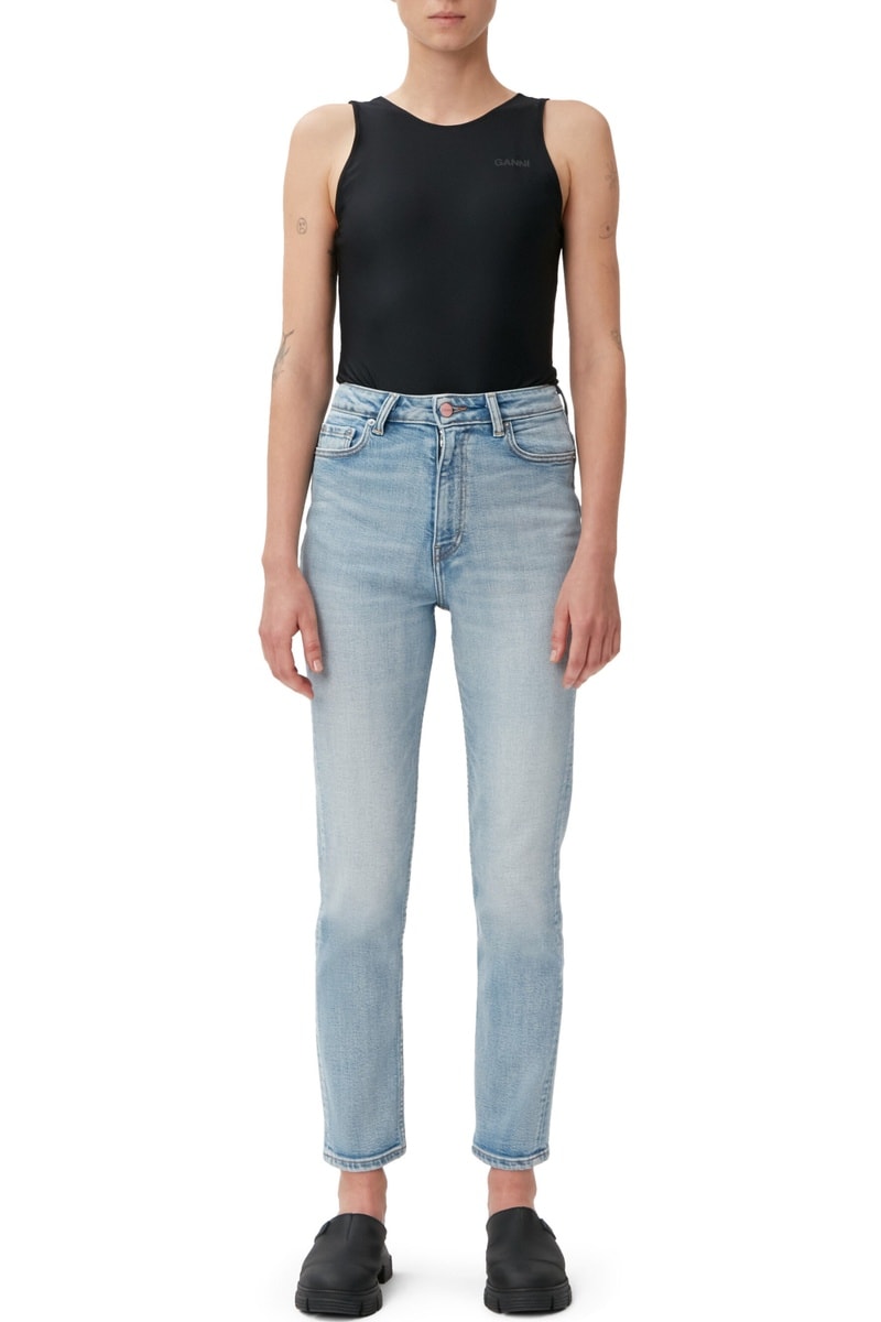 Calças de ganga de cintura alta slim em algodão biológico misturado.