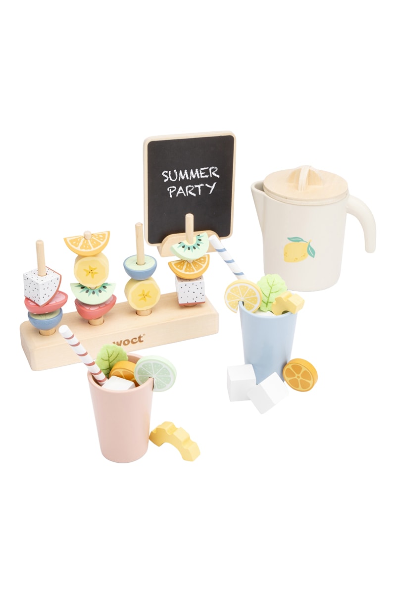 Com as suas espetadas de fruta, a limonada fresca e o seu ambiente ensolarado, este conjunto de jogo colorido em madeira de Woet® é perfeito para os pequenos que gostam de misturar, empilhar e servir.
