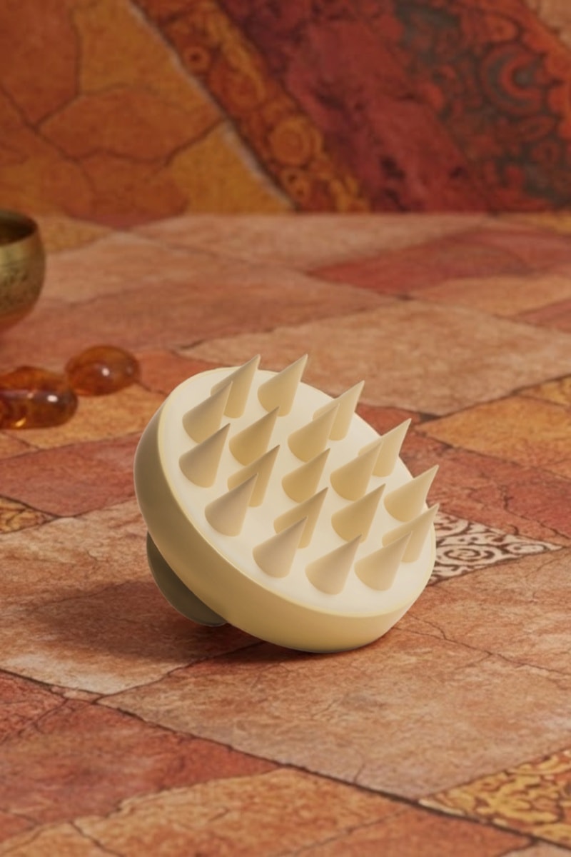 Ensaboe bem o cabelo e massaje o couro cabeludo com a escova, fazendo pequenos movimentos circulares. Enxague com água morna.