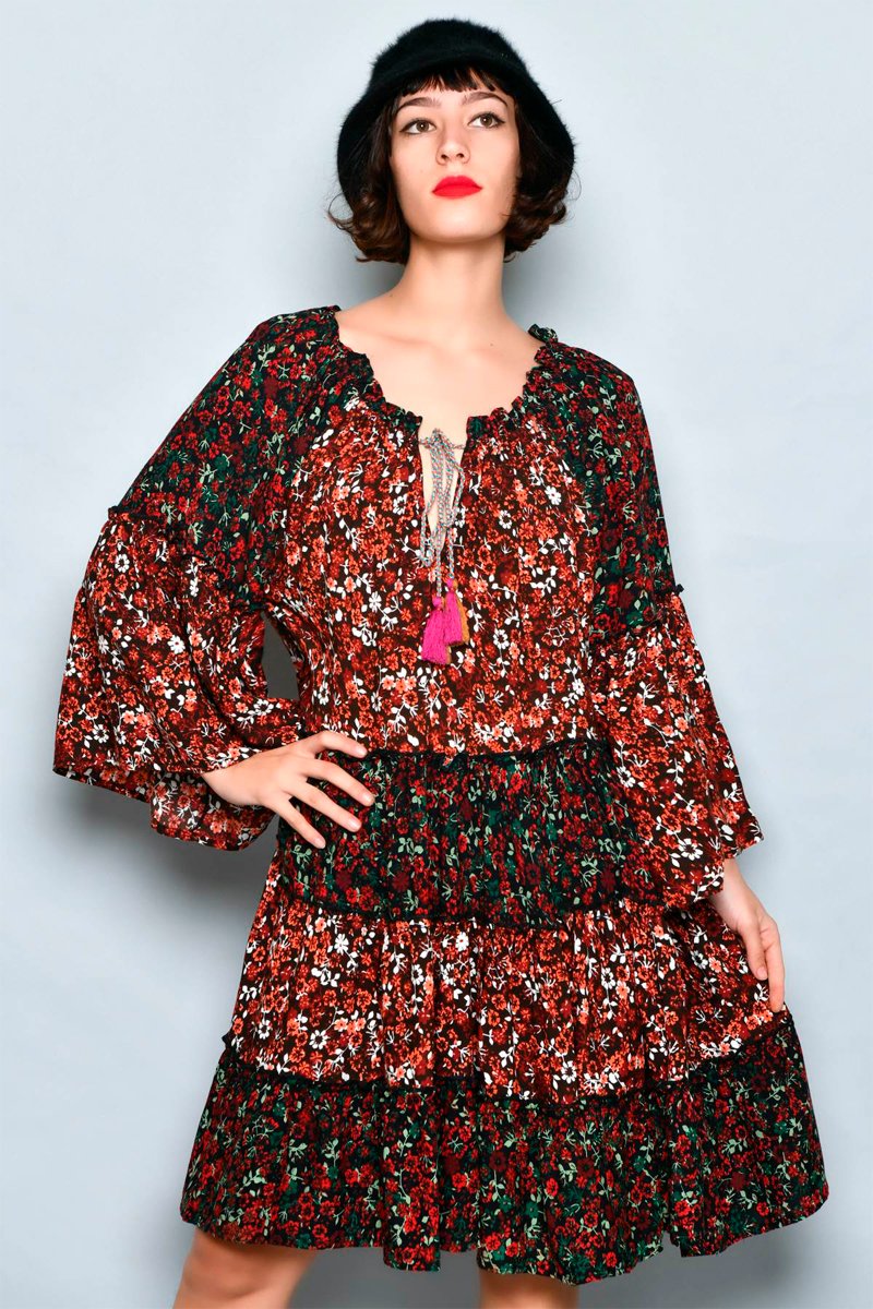 Vestido trapézio - Castanho e verde - Preto, vermelho, verde e castanho