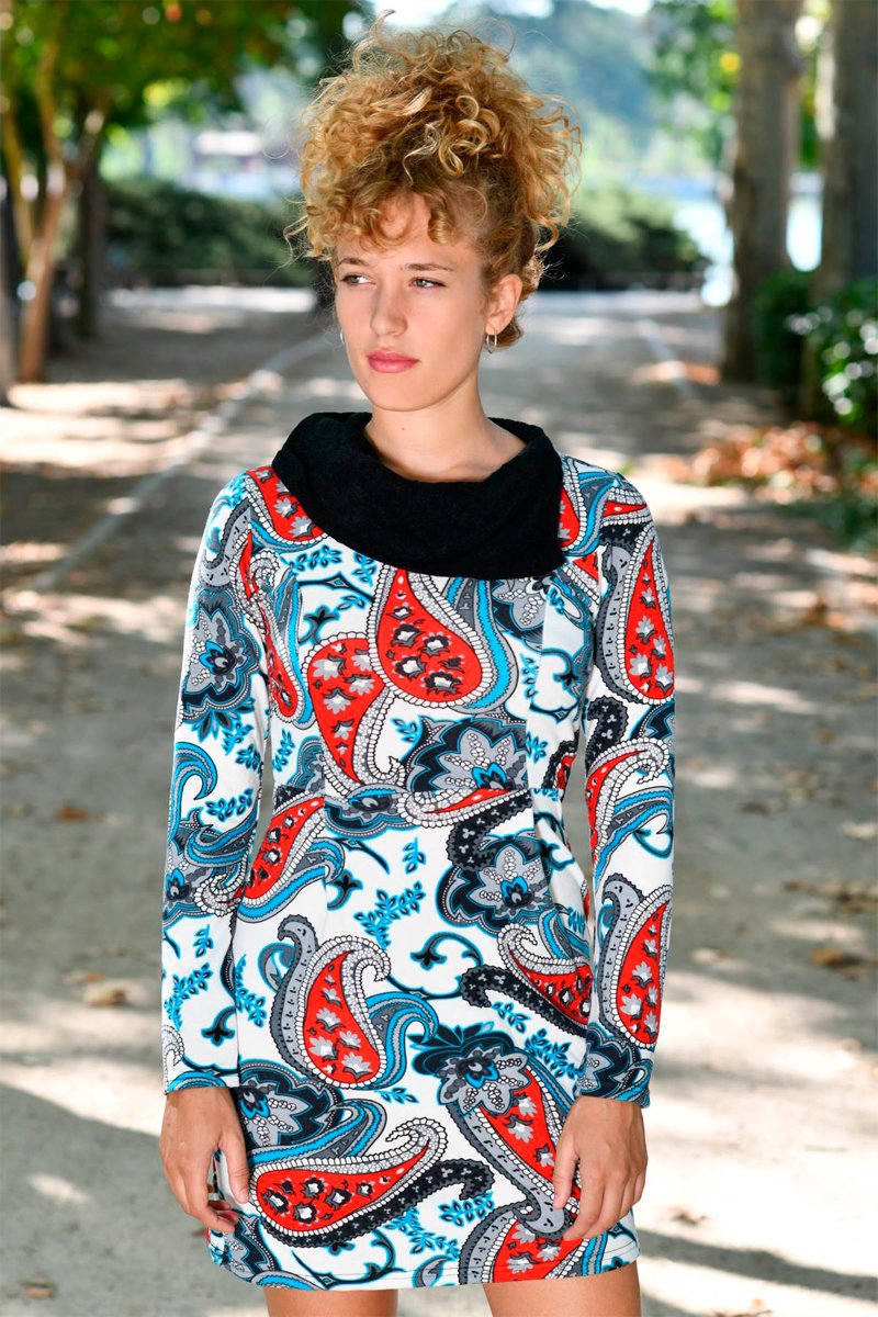 Vestido curto de mangas compridas.