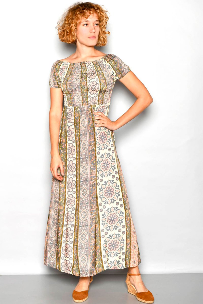 Vestido comprido - Rosa-claro e caqui - Branco, verde, laranja e rosa