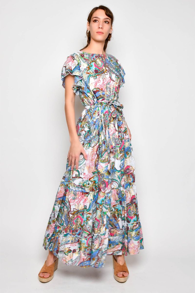 Vestido comprido de mangas curtas com folhos.
