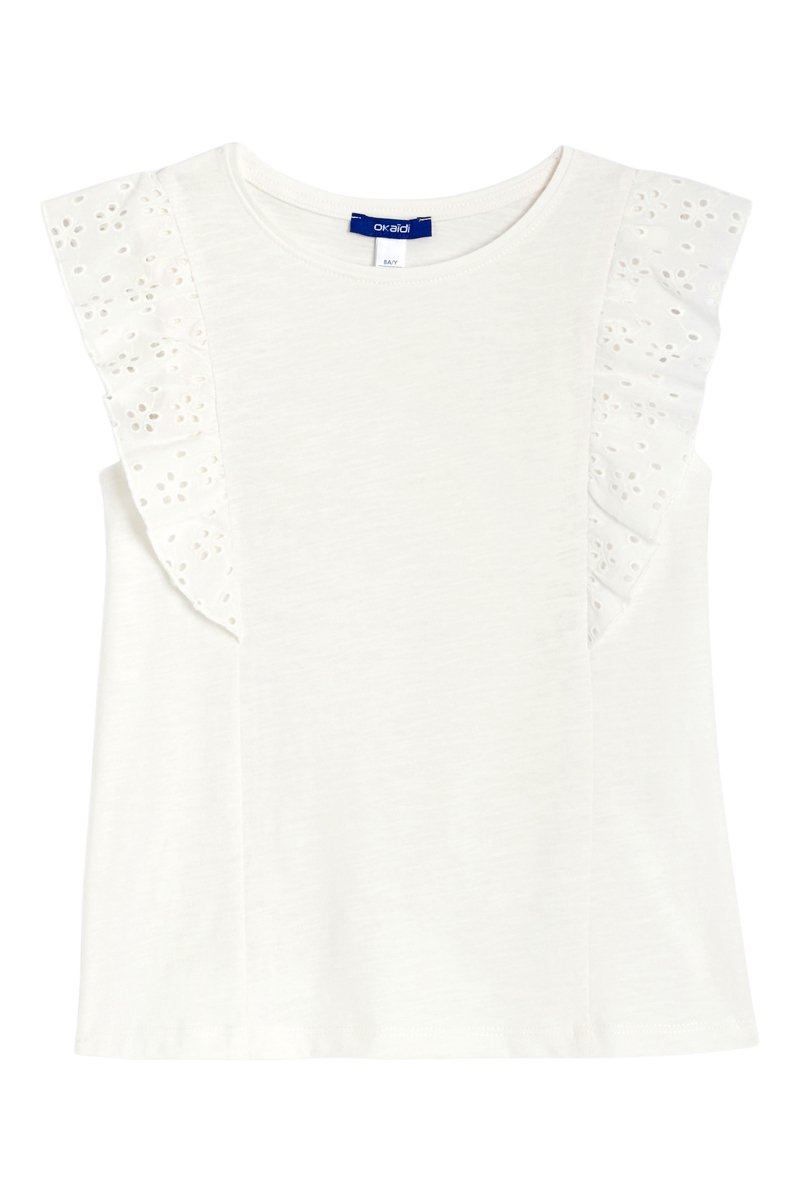 T-shirt de mangas curtas com folhos em bordado inglês.