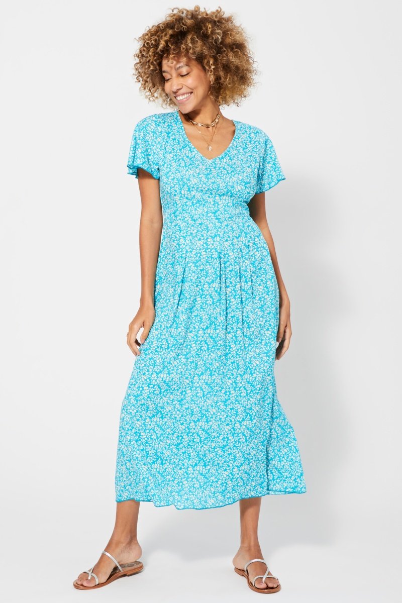 Vestido comprido de mangas curtas com folhos.