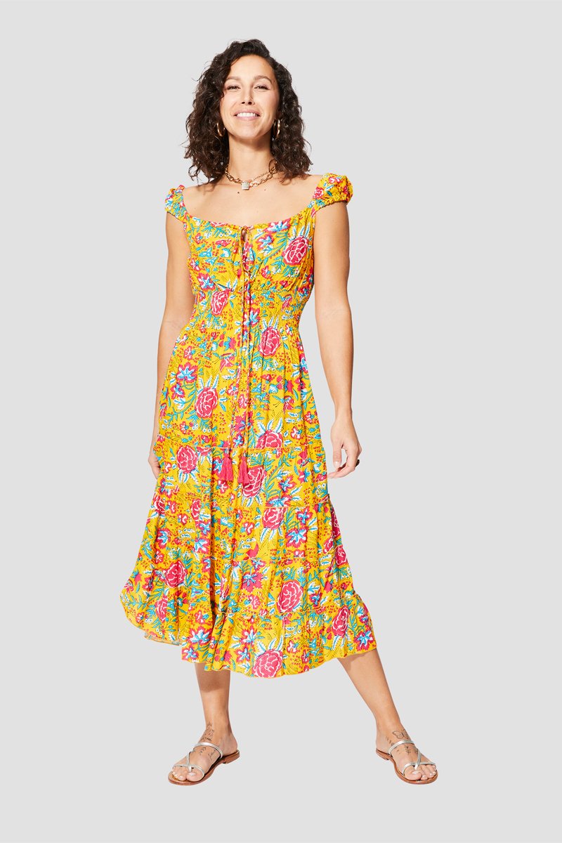 Vestido comprido - Amarelo - Rosa e azul