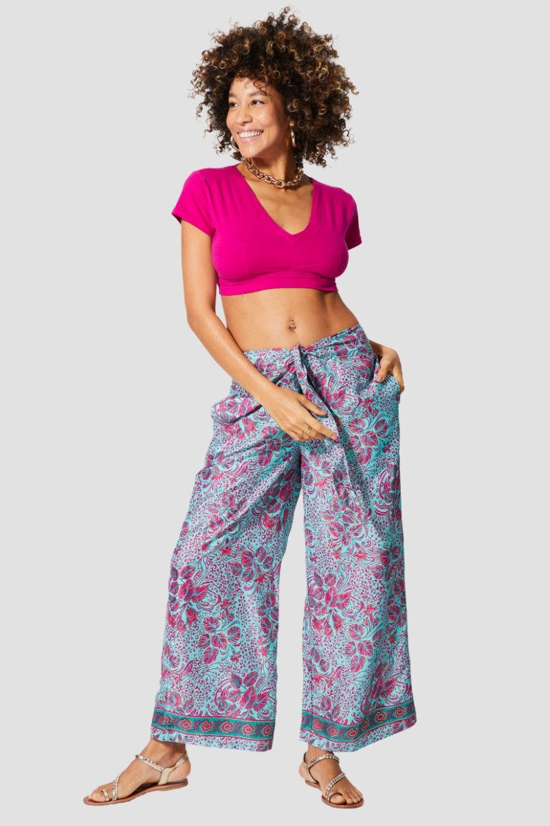 Calças wide legs - Azul - Azul e rosa