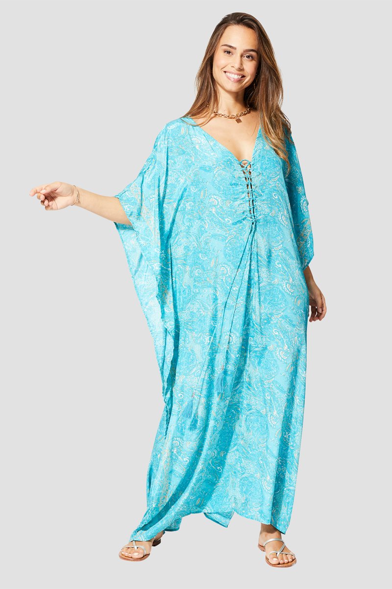 Cafetã - Turquesa e branco - Branco, bege e azul