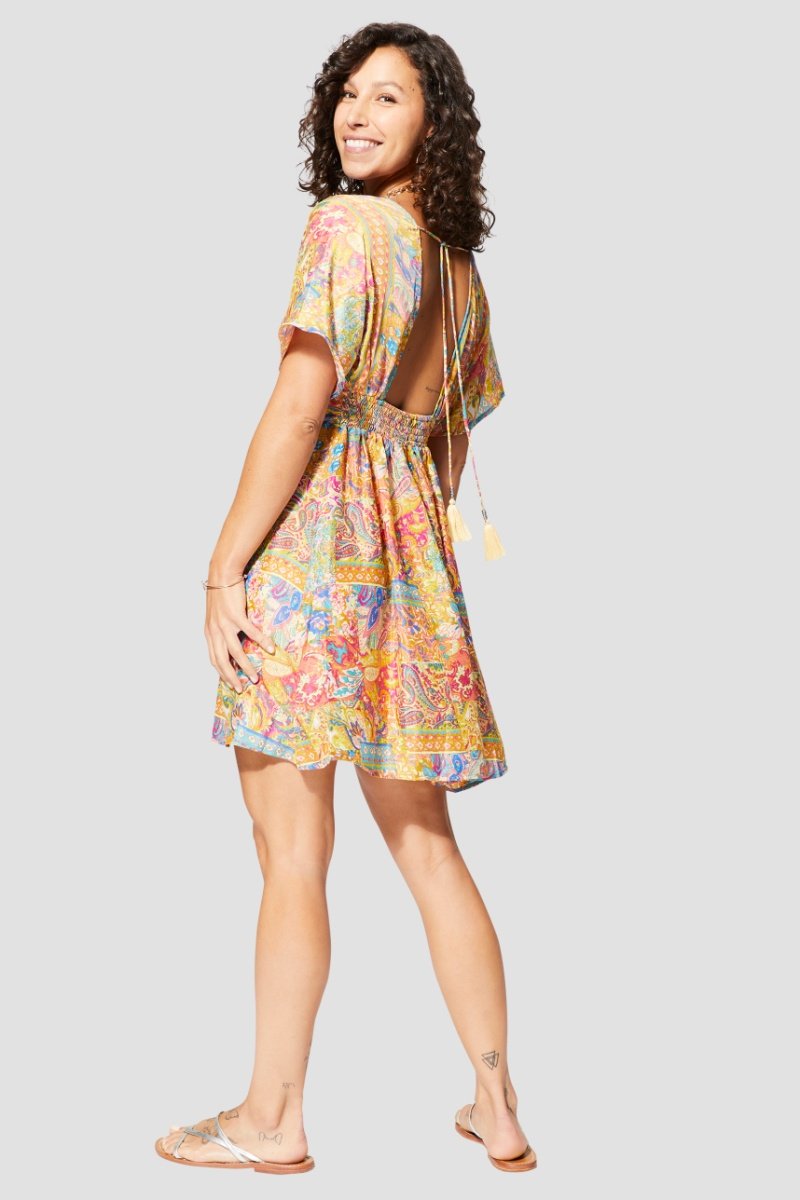 Smocks, atilhos de atar e decotado atrás.