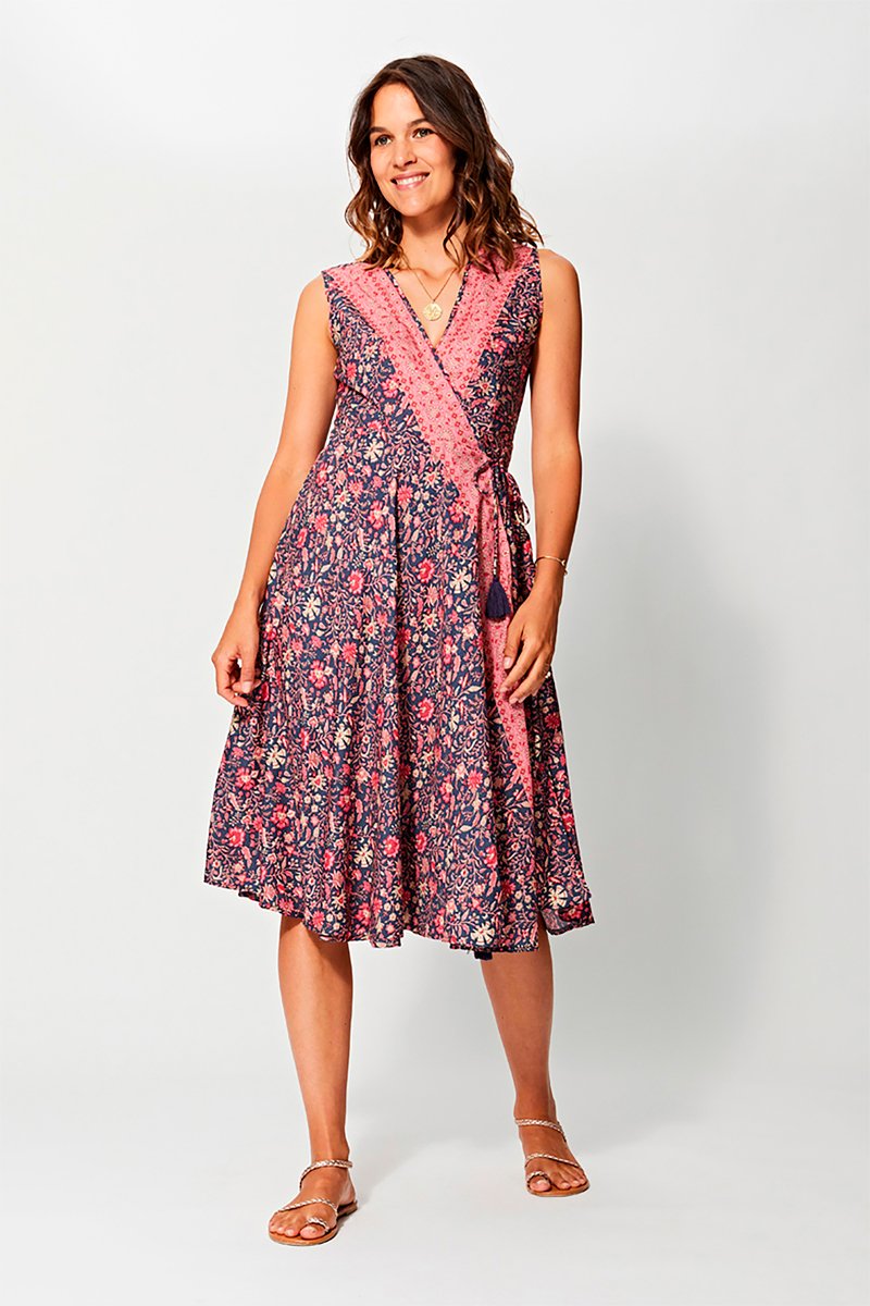 Vestido midi traçado - Azul-marinho e rosa - Bege, azul e rosa