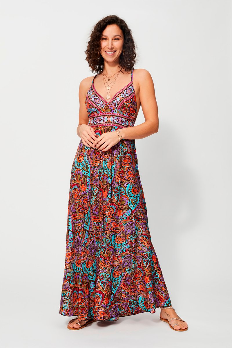 Vestido comprido - Castanho e laranja - Azul, castanho e laranja