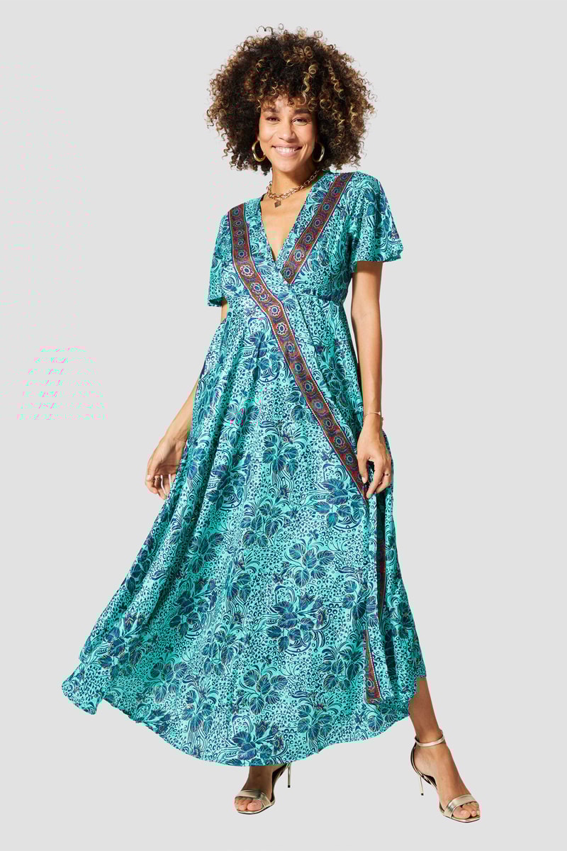 Vestido comprido de mangas curtas.