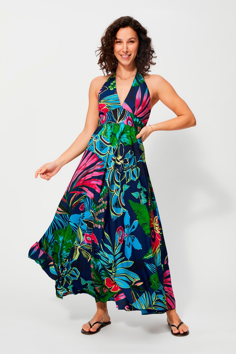 Vestido comprido - Azul-marinho e fúcsia - Azul, verde e rosa