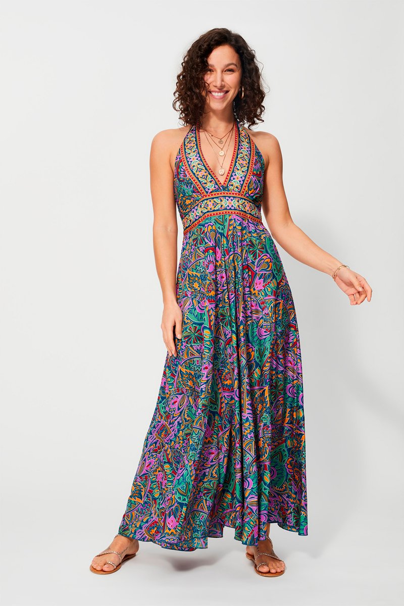 Vestido comprido - Azul-petróleo e turquesa - Vermelho, azul e violeta
