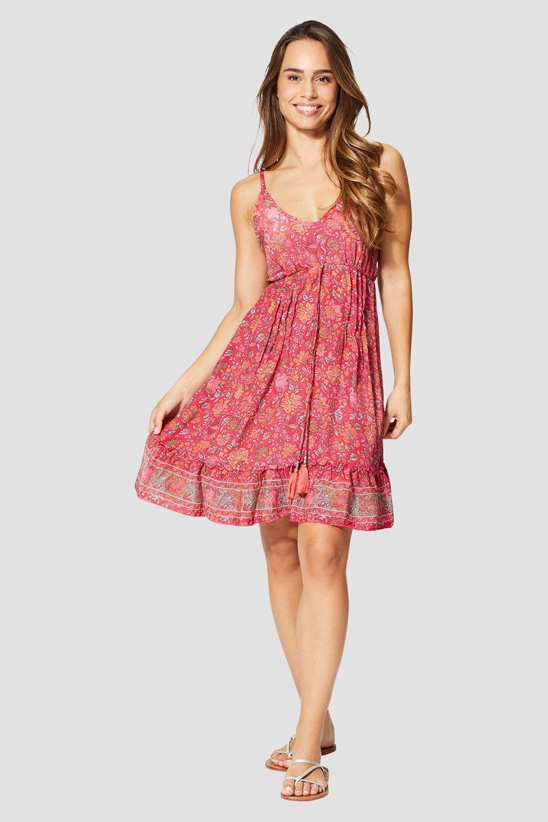 Vestido com folhos - Rosa - Vermelho, verde e rosa