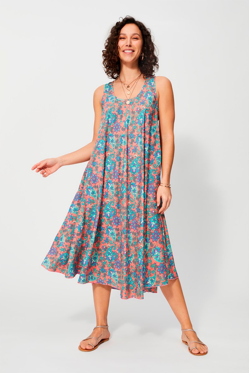Vestido trapézio - Rosa-velho e turquesa - Vermelho, azul e violeta
