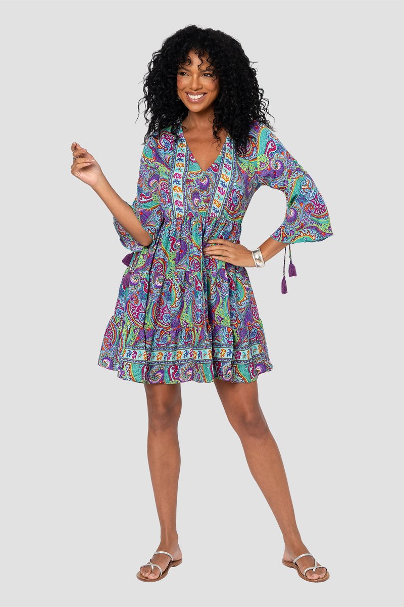 Vestido com folhos - Verde e violeta - Vermelho e verde